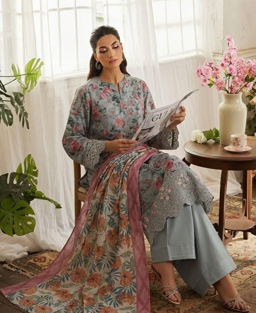 Step into soft elegance with our Floral Grace Printed 3 Piece Suit by Syedas Fashion. Designed for women who love subtle sophistication, this outfit features a beautifully detailed floral printed shirt paired with a coordinated dupatta and comfortable wide-leg trousers.
