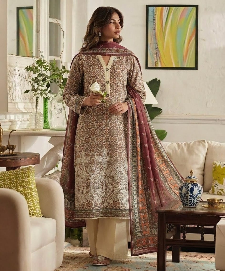 Add a touch of sophistication to your wardrobe with this beautifully crafted Mocha & Maroon Ethnic Printed Lawn 3 Piece Suit. Designed with intricate traditional motifs, this outfit radiates timeless eastern charm with a modern finish.