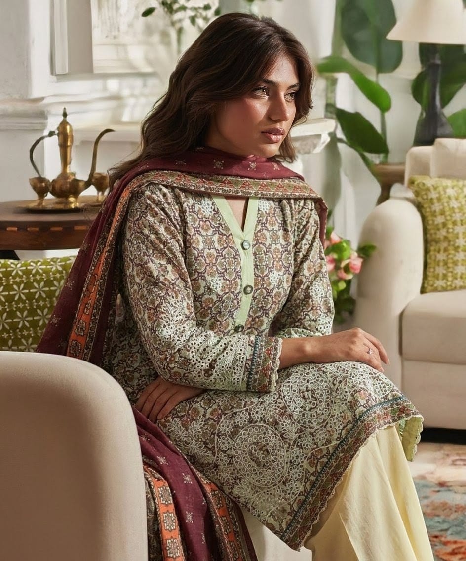 The highlight of this ensemble is the deep maroon dupatta, adorned with intricate ethnic patterns and beautifully crafted borders that add depth and luxury to the outfit. Lightweight and breathable, this lawn suit is ideal for warm weather while maintaining a festive appeal.