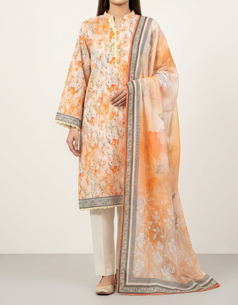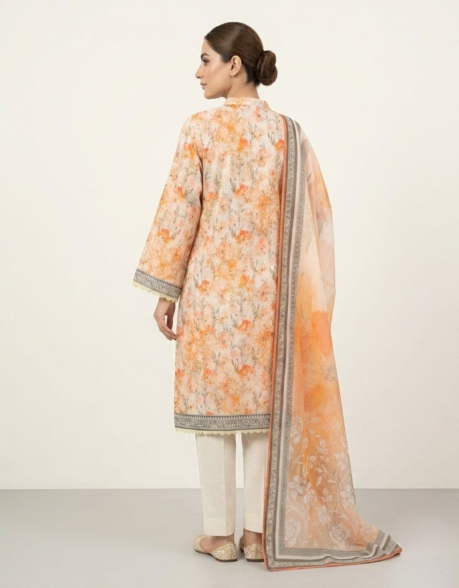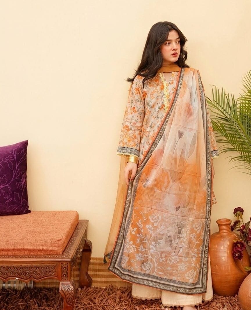 Refresh your wardrobe with this beautifully designed Peach Embroidered Lawn 3 Piece Suit by Syeda’s Fashion. Crafted in a soft peach tone, this outfit radiates elegance and sophistication.