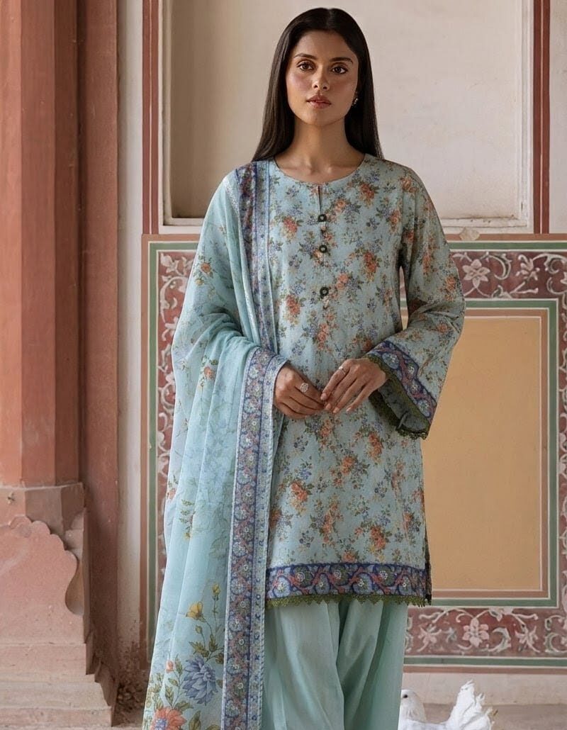 Elevate your everyday style with this elegant 3-piece unstitched lawn ensemble. Featuring a refreshing sky blue base, the shirt is adorned with intricate vintage floral prints in warm earthy tones.